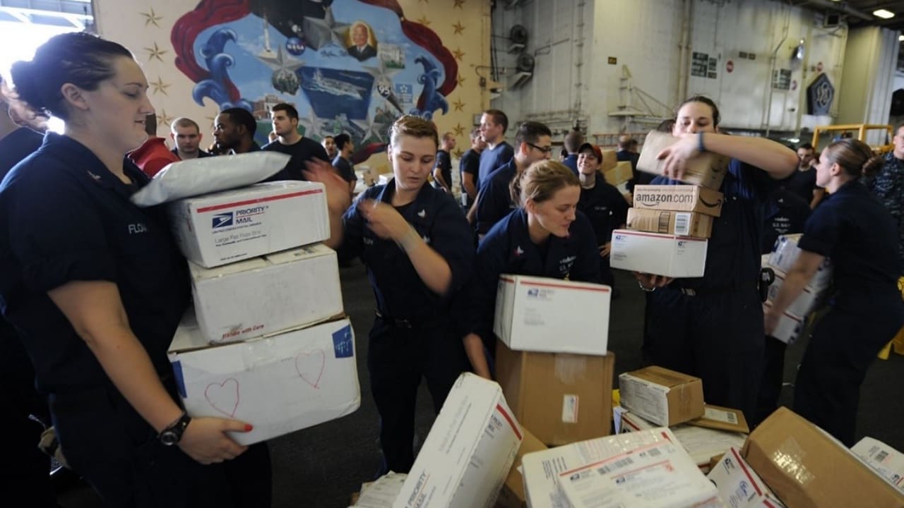 Photo: Sailors sort boxes during a mail call aboard the USS Dwight D. Eisenhower in the Arabian Sea. (U.S. Navy photo by Petty Officer 3rd Class Ryan D. McLearnon)