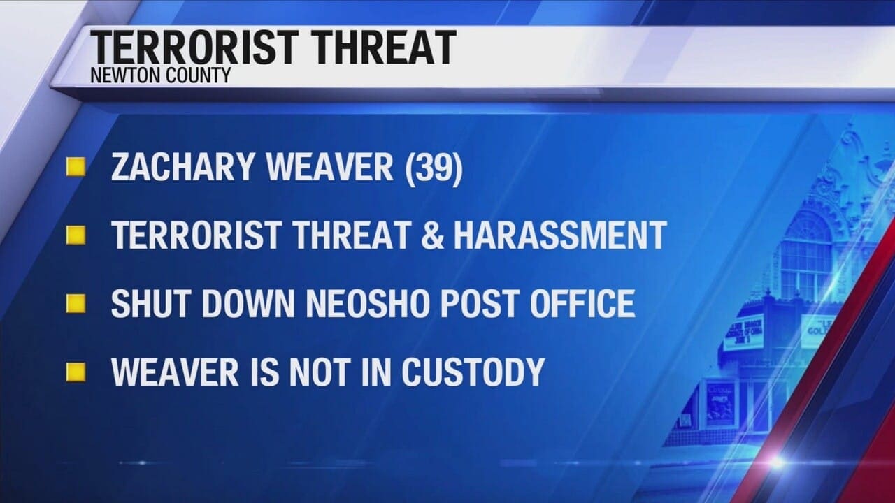 Police say Weaver continuously called an alleged victim and threatened to shoot him and “shoot up” the Neosho post office where the alleged victim works.
