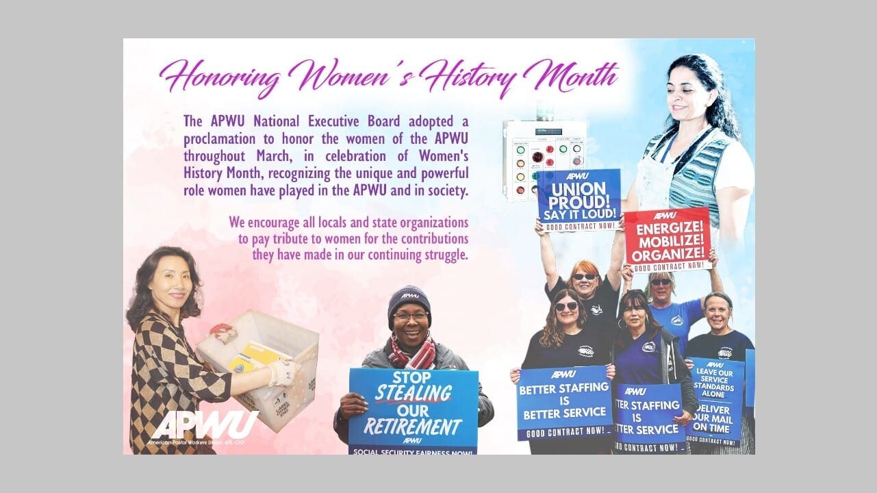 The APWU National Executive Board met February 5-6 and adopted a proclamation to honor the women of the APWU throughout March, Women’s History Month, recognizing the “unique and powerful role” women have played in the APWU and in society.