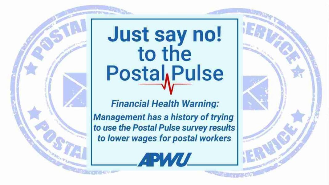 Starting April 25 through May 26 2023, the USPS is pushing its annual Postal Pulse Survey. The APWU leadership urges you to not let the Postal Service take your Pulse! APWU is set to begin contract negotiations with the Postal Service in 2024. In the past, management has used surveys as a weapon against us in negotiations, while not producing any real positive change for employees at the Postal Service.