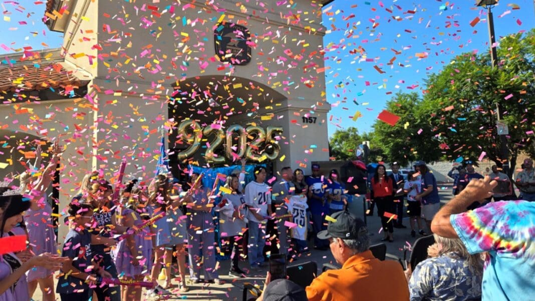 Escondido set off streamers to a cheering crowd at exactly 9:20 and 25 seconds on the morning of Sept. 20. Attendees could also see a new USPS delivery vehicle, mingle with postal employees and collect a special cancellation stamp designed by local artist Hannah Ramirez. Escondido Mayor Dane White helped welcome guests.