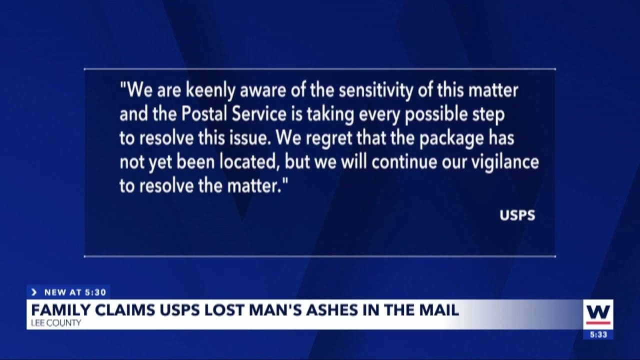 The United States Postal Service (USPS) last scanned the package at a distribution center in Lee County on January 16, and it has since vanished.