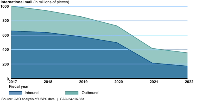 The United States Postal Service’s (USPS) international mail volume declined from about 1 billion pieces in fiscal year 2017 to about 355 million pieces in fiscal year 2022 (see figure). USPS officials stated that the drop was caused primarily by the implementation of substantially higher rates in 2020. These rates are called “self-declared” rates because the U.S. and other countries were allowed to set their own rates for certain inbound international mail items. USPS’s inbound volume subject to self-declared rates fell substantially from fiscal year 2017 to fiscal year 2022. USPS’s revenue from international mail also declined over this period but still covered or exceeded its costs.