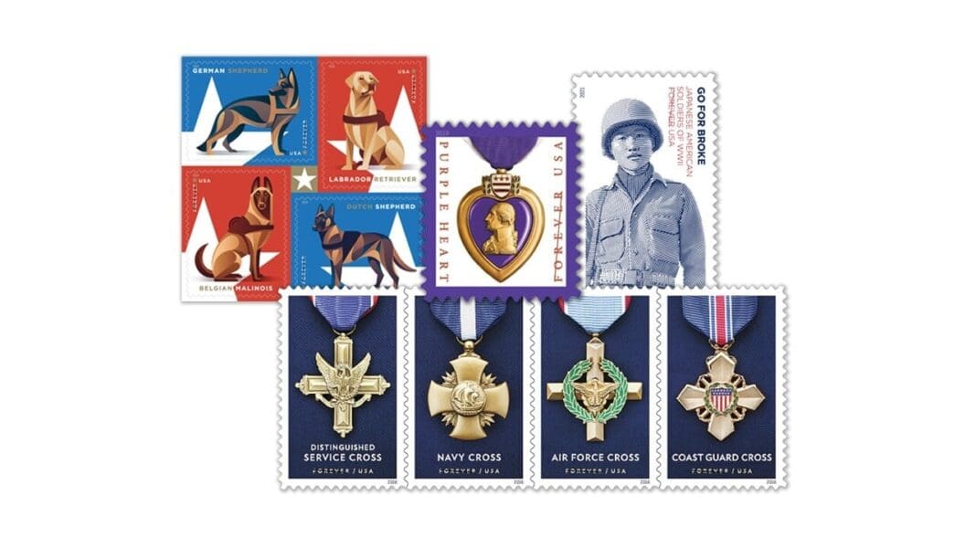 The Postal Service has long paid tribute to the armed forces through its stamp program. Some of the more recent releases include Go for Broke: Japanese American Soldiers of WWII (2021); the Purple Heart Medal (2019); Military Working Dogs (2019); and the Service Cross Medals (2016).
