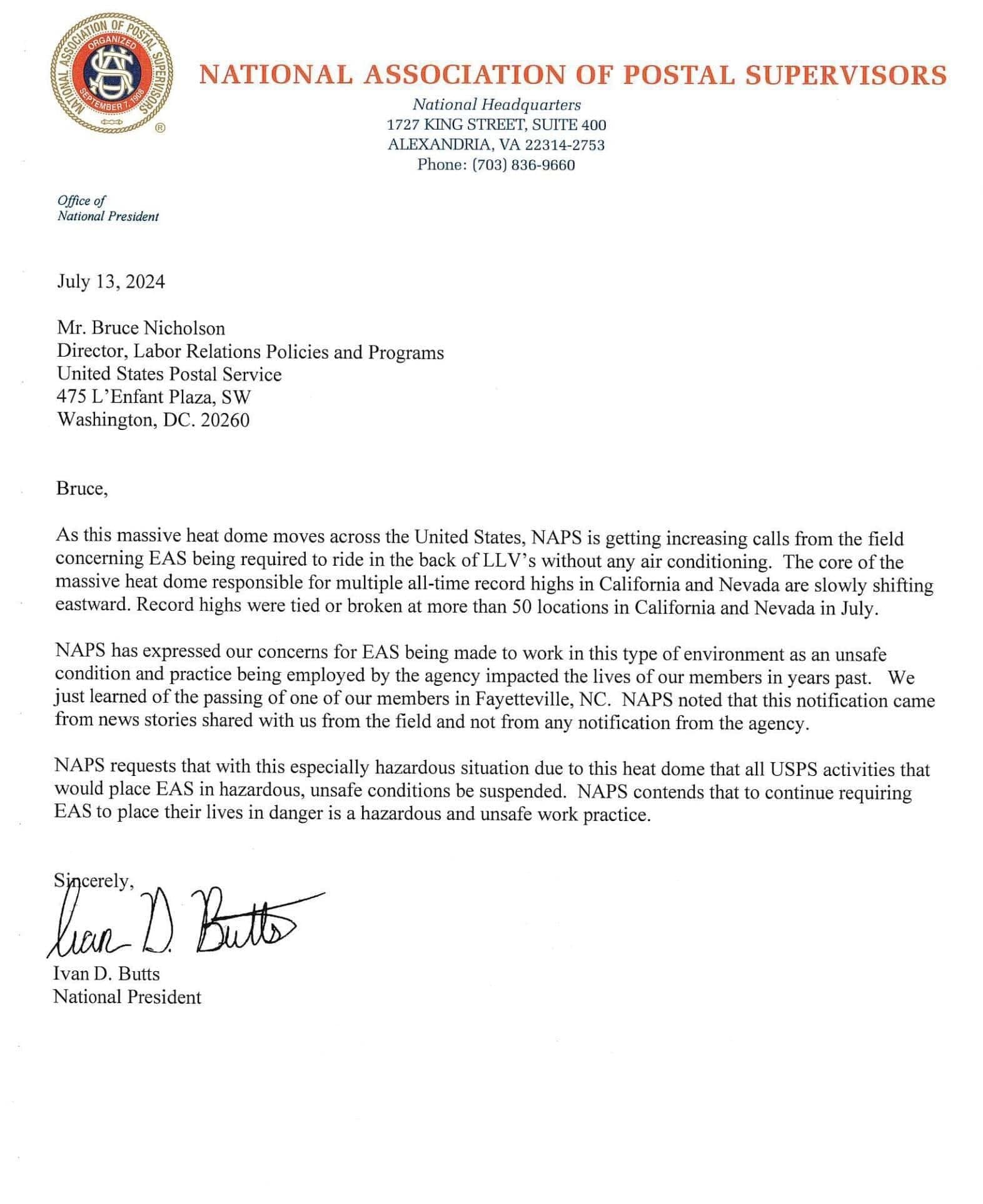 NAPS requests that with this especially hazardous situation due to this heat dome that all USPS activities that would place EAS in hazardous, unsafe conditions be suspended. NAPS contends that to continue requiring EAS to place their lives in danger is a hazardous and unsafe work practice.