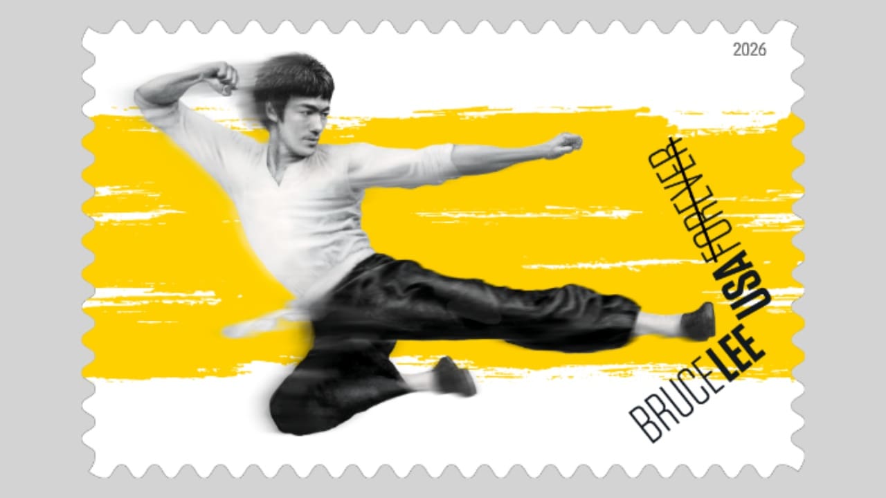 - The stamp artwork features a black-and-white painting of Lee executing his famous flying kick set against a yellow calligraphic brushstroke on a white background. The brushstroke is a reference to Lee’s iconic yellow tracksuit in the film “The Game of Death,” which was completed and released years after his death.