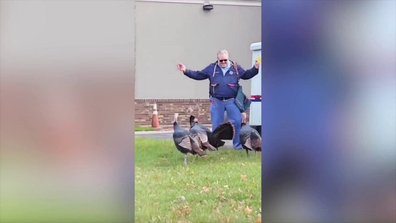 These wild turkeys took “follow the leader” to a new level by following their local postman on his route. Todd Wiegmann was delivering mail during his shift in Marinette, Wisconsin, when his friend spotted turkeys following him. See the moment!