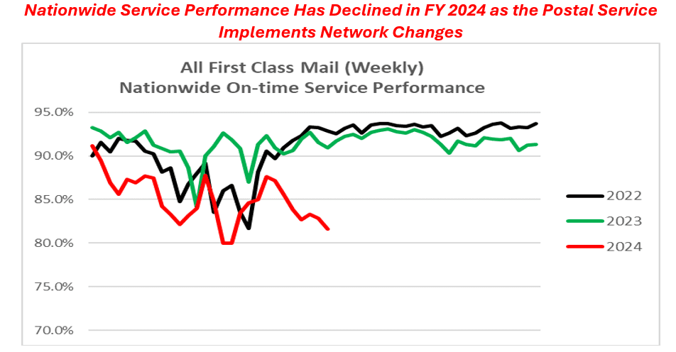 In a previous order, the Commission explained that the DFA Plan is not in and of itself a change requiring an advisory opinion. However, the Commission noted that specific initiatives could require a request for an advisory opinion. Since the Commission’s last advisory opinion in 2022, the Postal Service has introduced and begun implementing new DFA initiatives, including an overhaul of its processing and delivery network, local transportation optimization, and logistics career insourcing. The show cause order noted a correlation between the DFA network changes and service problems in areas implementing the changes, such as Atlanta, GA, Houston, TX, and Richmond, VA. The Commission also noted that nationwide service performance has been declining.