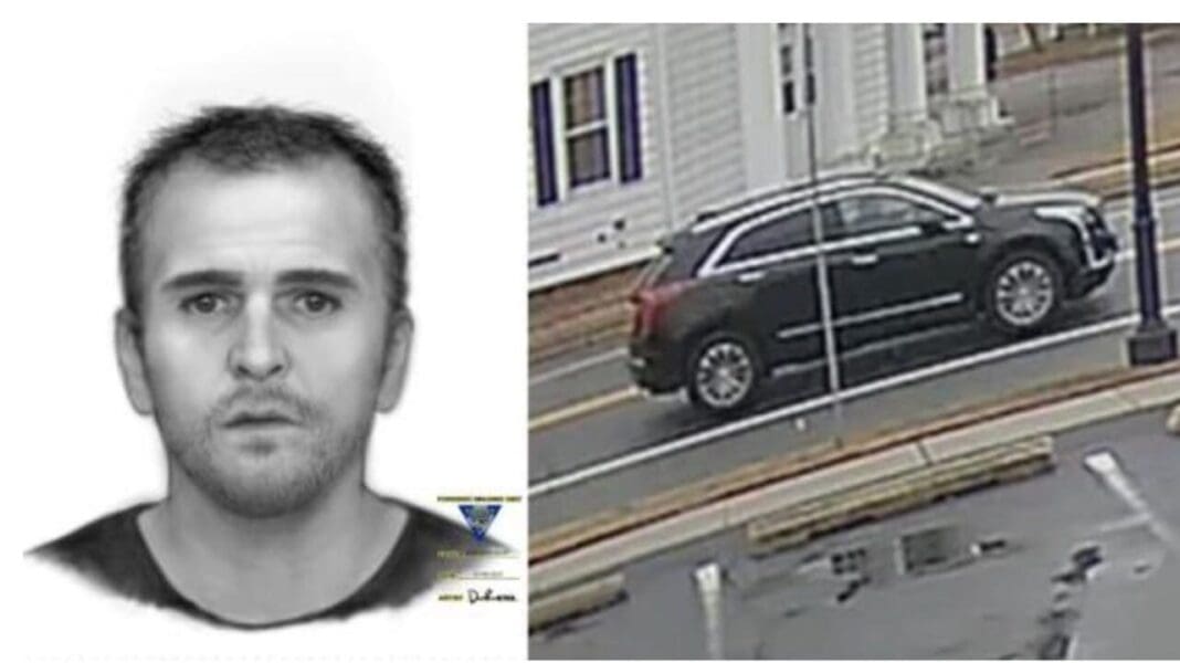The suspect is described as a white male, approximately 6′”, between 40 and 50 years old, with dirty blond hair, a scruffy beard, and wearing a dark t-shirt.