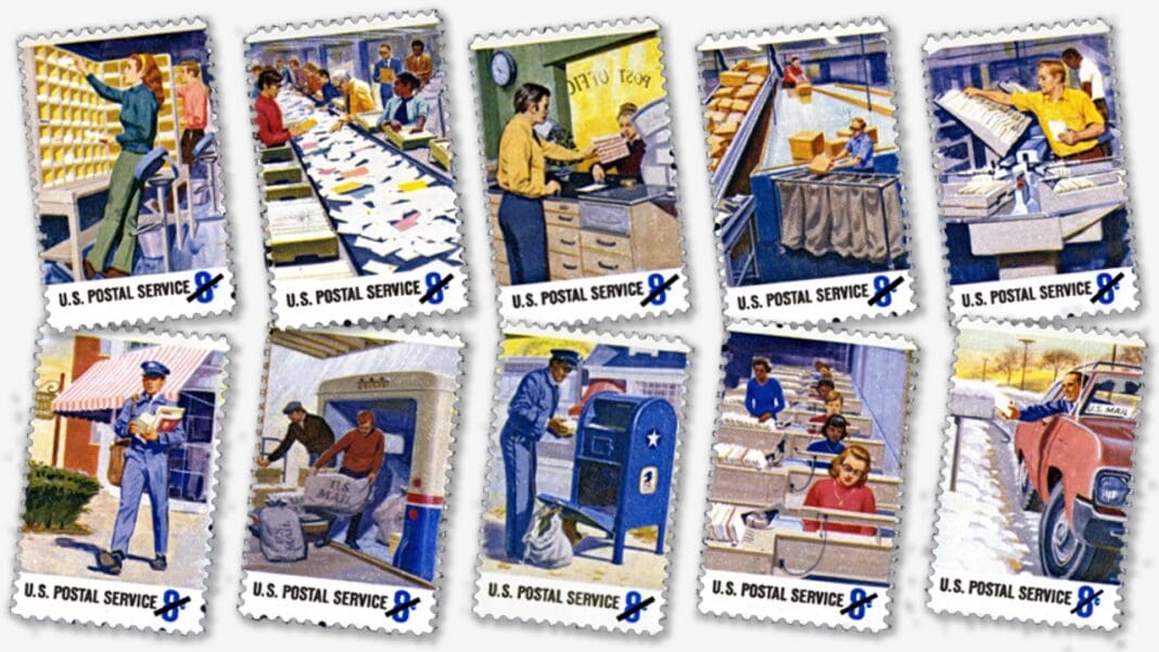 • Postal Service Employees, a set of 10 designs released in 1973 that included colorful midcentury drawings of letter carriers, retail associates, rural carriers and more.