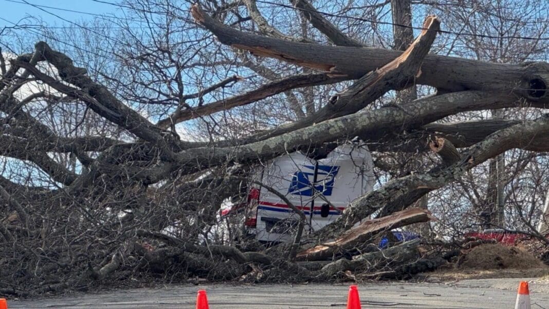 NEWINGTON, Conn. (WTNH) — A tree fell and landed on power lines and a USPS vehicle Friday morning, according to the Newington Fire Department.