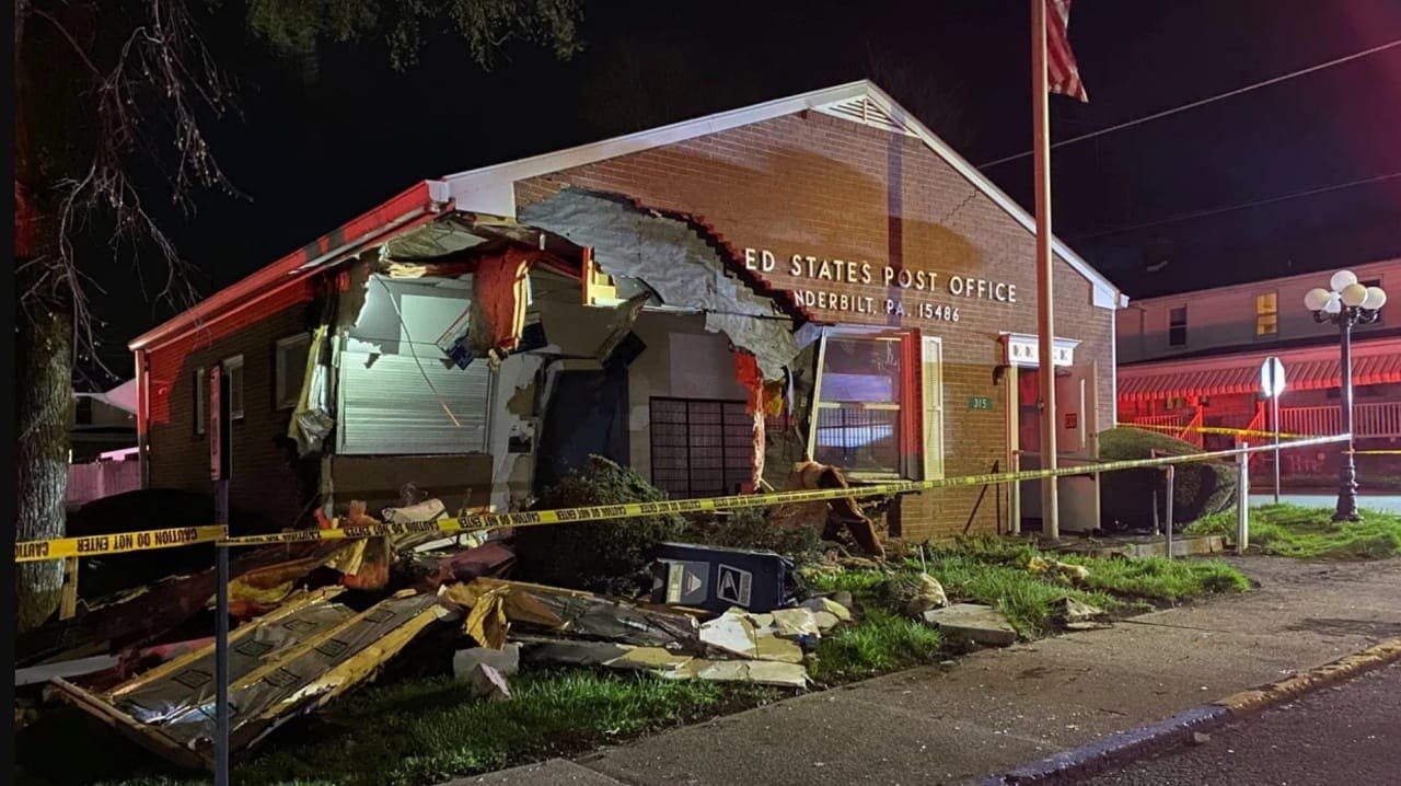A truck slammed through the side of the Post Office branch located in Vanderbilt Borough, Fayette County during a police chase early Tuesday morning.