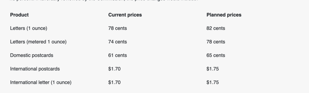 The PRC will review the changes before they are scheduled to take effect. The complete Postal Service price filing, with prices for all products, can be found on the commission’s website under the Daily Listings section. The Mailing Services filing is Docket No. R2026-1. The price tables are also available on the Postal Service’s Postal Explorer website at pe.usps.com/PriceChange/Index.