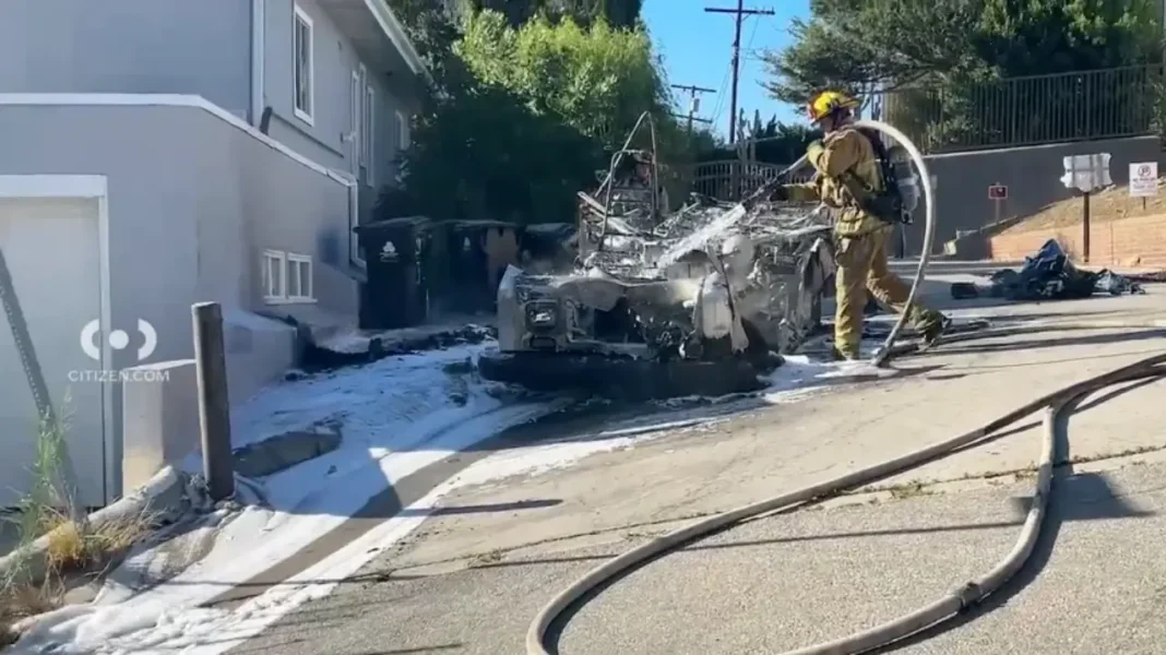 Details are limited and it’s unclear exactly how the blaze started, but images of the incident posted to the Citizen App show heavy smoke coming from the vehicle, parked perilously close to a home, as firefighters doused it with water and foam.