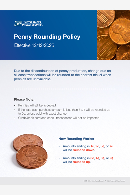 Because pennies are no longer produced by the U.S. Mint, the Postal Service is rounding to the nearest nickel on change due the customer for cash transactions when pennies are unavailable.