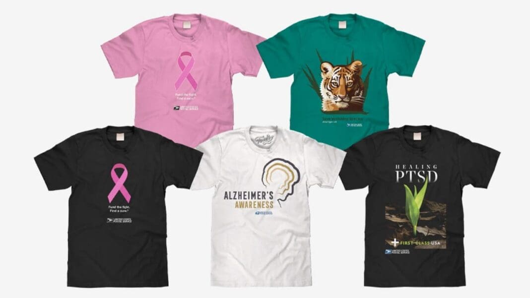 To promote the stamps, employees can order special T-shirts, at their own expense, from Tee Luv, a provider of USPS-licensed apparel. Orders can be placed through Friday, Aug. 15, using the password USPS2025.