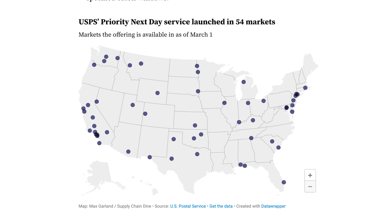 The U.S. Postal Service launched its Priority Next Day offering on Saturday with availability in 54 markets currently, according to an announcement from the agency.
