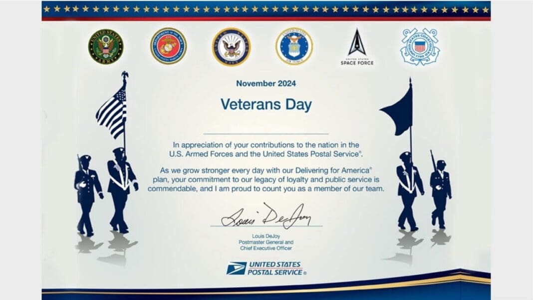 The certificates will be signed by Postmaster General Louis DeJoy and mailed to the homes of all employees who have self-identified as veterans. Veterans are encouraged to update their mailing addresses through the MyHR website.