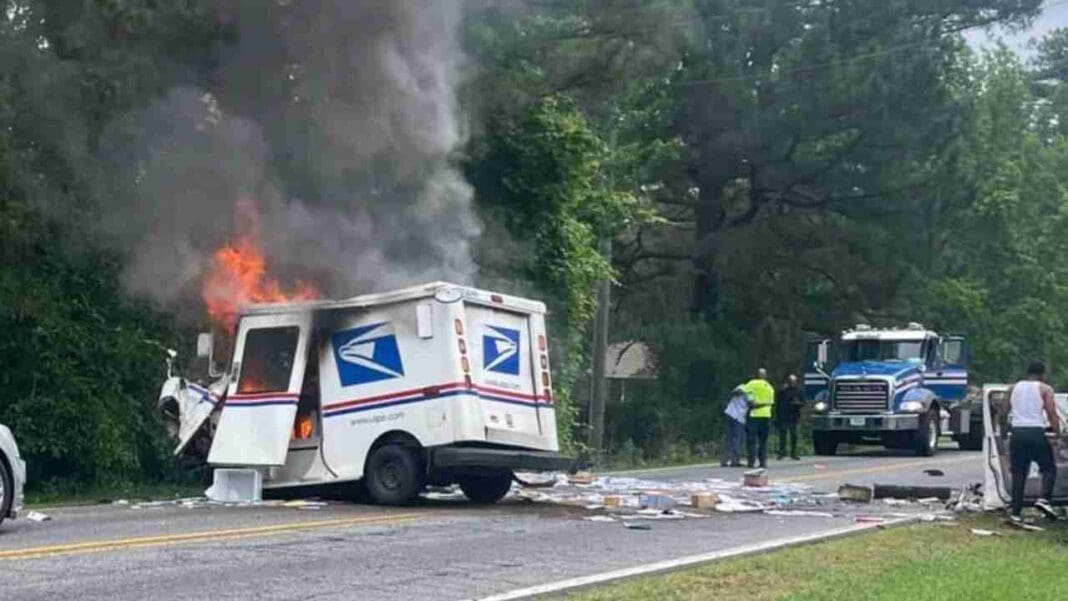 A mail truck was in a head on collision in Clayton County today. The other driver tried to swerve out of the way. Firefighters think the mail truck malfunctioned. You can see the mail carrier being comforted by a truck driver in the background of the wreckage.