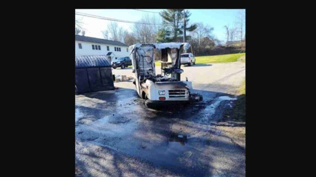 Police said first responders were called to Dresser Hill Road at about 11:43 a.m. for a report of a mail delivery vehicle “fully engulfed in flames.”