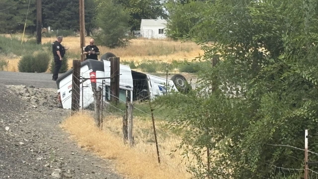 PROSSER, Wash. – Police responded to a crash in a rural area in Benton County Wednesday morning to find a mail truck had flipped onto its roof in a ditch.