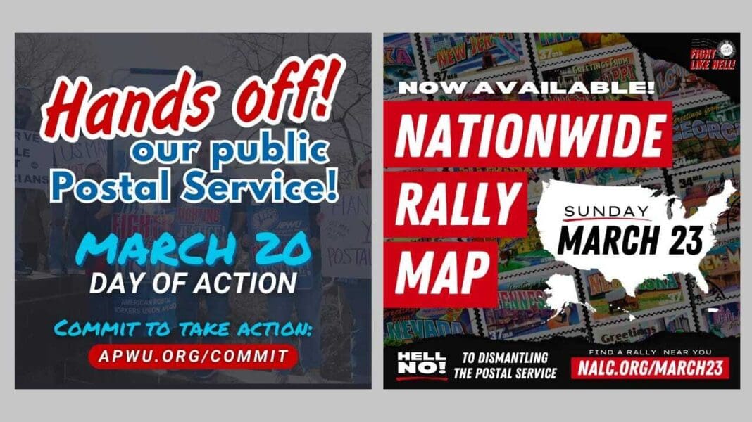 On Thursday, March 20, the APWU will hold “U.S Mail is Not For Sale!” rallies across the country “to ensure our postal service stays in the hands of the people, not the billionaires.” A map of the locations of the rallies is here.