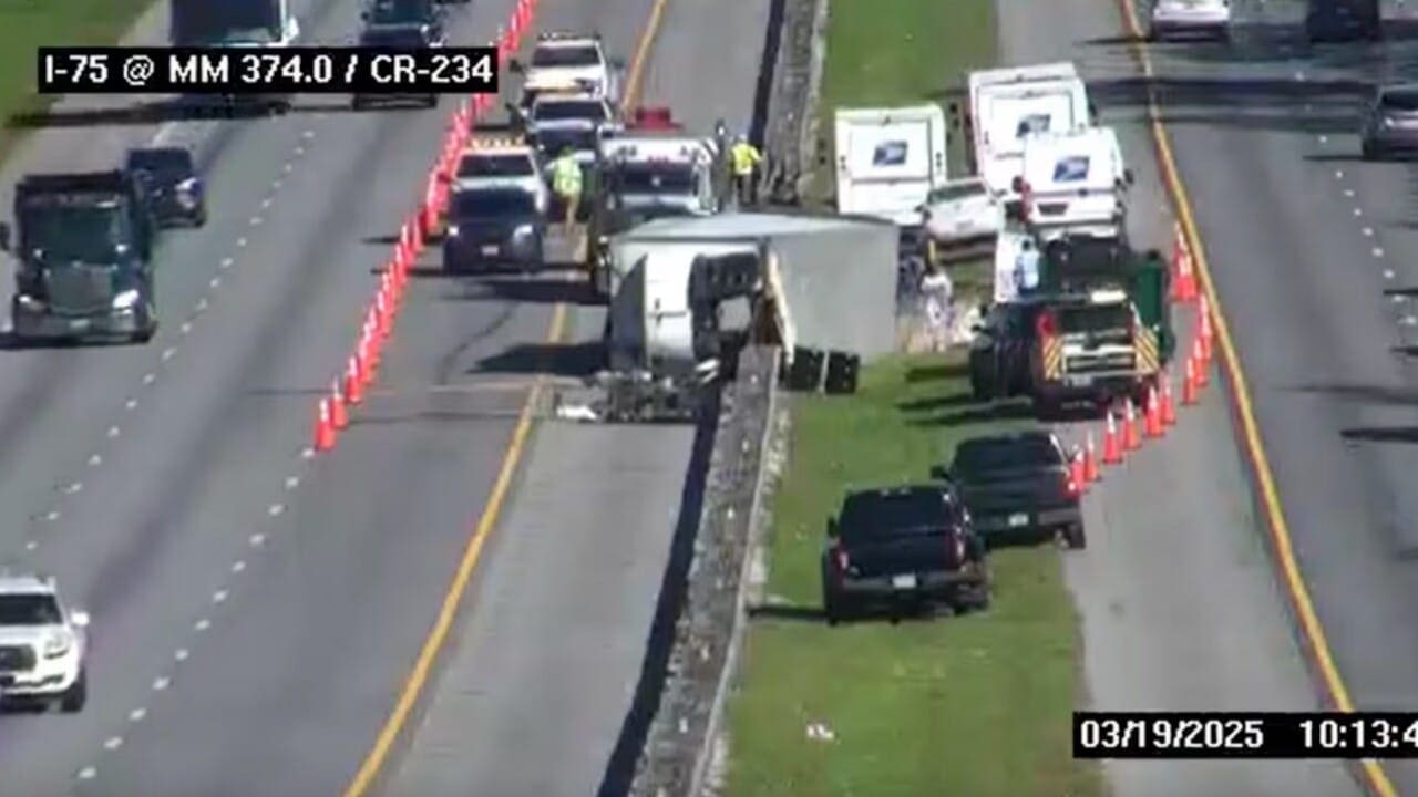 MICANOPY, Fla. (WCJB) – United States Postal Service (USPS) workers responded to Interstate 75 in an effort to recover mail that had spilled onto the roadway after a semi-truck flipped in the median.