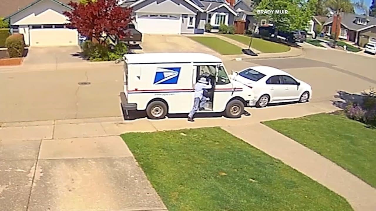 He was shocked at what he saw. The video shows a mail delivery truck with no driver inside slowly rolling away from the curb. The driver runs back and jumps inside.